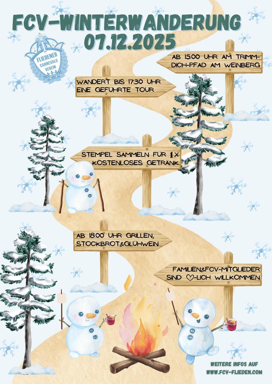 Am 07.12.2025 findet die FCV-Winterwanderung statt. Wir wollen mit Euch zusammen in die Vorweihnachtszeit starten und laden euch hierzu für den 7.12. ab 15:00 Uhr auf den Trimm-Dich-Pfad am Weinberg in Flieden ein. Zwischen 15:00 und 17:30 Uhr habt ihr die Möglichkeit, eine kurze, geführte Wanderung von 2 km Länge mit 4 Stationen über den Weinberg mitzumachen. An diesen vier Stationen könnt ihr jeweils Stempel sammeln, um danach ein zusätzliches Getränk kostenlos zu bekommen! Start und Ende ist am Trimm-Dich-Pfad Schotterplatz. Dort gibt es im Anschluss ab 18:00 Uhr ein kleines Weihnachtssingen mit Grillen, Stockbrot und Glühwein, um gemeinsam den 2. Advent gemütlich ausklingen zu lassen. Eingeladen sind alle Familien, Interessierten und FCV-Mitglieder. Für FCV-Mitglieder ist das 1. Getränk zusätzlich kostenlos (jedes weitere 1€), denn wir möchten uns bei Euch für die ganzjährige Unterstützung bedanken. Wir freuen uns auf Euch und eure zahlreiche Teilnahme!