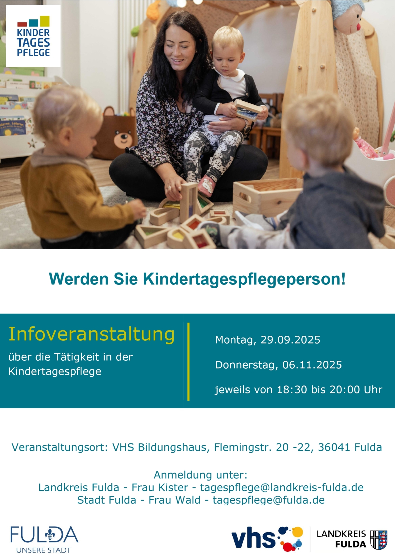 Haben Sie Interesse an der Tätigkeit als Kindertagespflegeperson? Regelmäßig bietet der Landkreis Fulda in Zusammenarbeit mit der Volkshochschule des Landkreises Fulda Qualifizierungskurse zur Kindertagespflegeperson an.