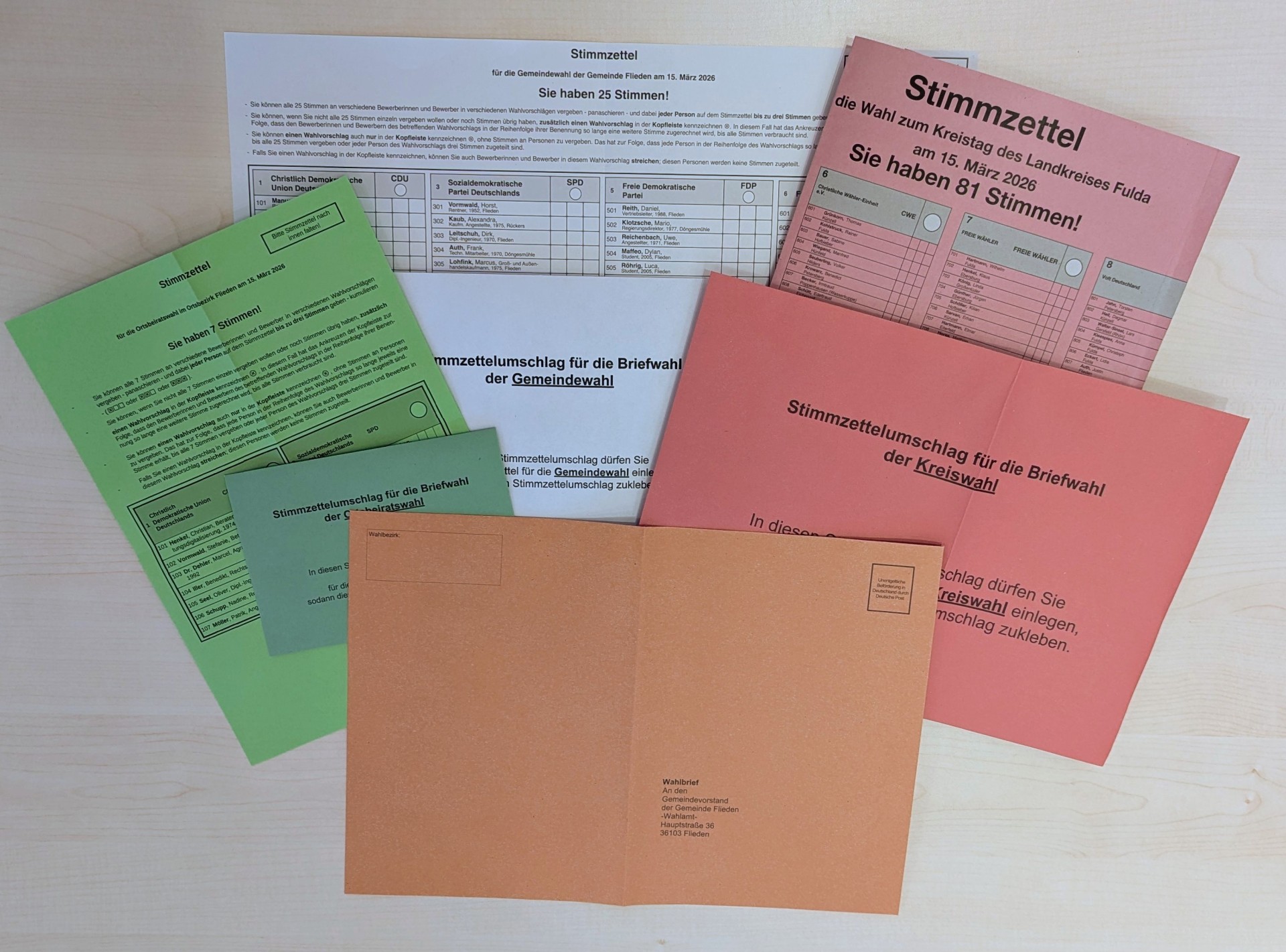 Die von Ihnen zurückzugebenden Wahlbriefe müssen bis zum 15.03.2026, 18:00 Uhr, bei der Gemeindeverwaltung Flieden eingegangen sein. Bei späterem Eingang werden die Wahlbriefe bei der Auszählung nicht berücksichtigt!